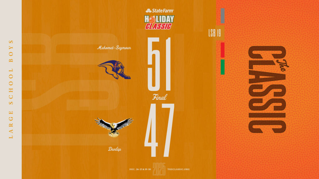 2025 Results LSBLSB: Mahomet-Seymour 51 / Dunlap 47 December 29, 2025 by The Classic 1234TDunlap611111947Mahomet-Seymour81392151 View the game results and box score at TurboStats: https://statefarmholidayclassic.sportstrack.app/basketball/seasons/265/box-scores/9982 Related posts LSB Championship: Normal Community 59 / Rock Island 44 LSG Championship: Washington 52 / Chicago DePaul College Prep 36 SSB Championship: Quincy Notre Dame 72 / Joliet Catholic Academy 59 SSG Championship: Paris 53 / Winnebago 40 Previous Post:LSB: Wheaton Warrenville South 42 / Chatham Glenwood 30 Next Post:LSB: Wheaton Warrenville South 50 / Bradley-Bourbonnais 22