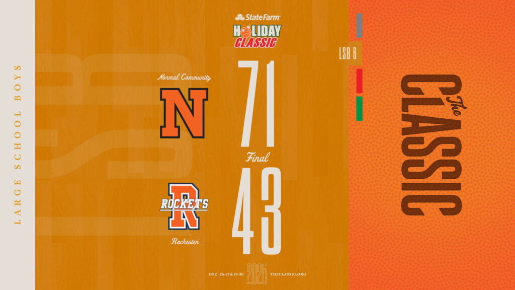 2025 Results LSBLSB: Normal Community 71 / Rochester 43 December 26, 2025 by The Classic Team1234TNormal Community2414171671Rochester151113443 View the game results and box score at TurboStats: https://statefarmholidayclassic.sportstrack.app/basketball/seasons/265/box-scores/9969 Related posts LSB Championship: Normal Community 59 / Rock Island 44 LSG Championship: Washington 52 / Chicago DePaul College Prep 36 SSB Championship: Quincy Notre Dame 72 / Joliet Catholic Academy 59 SSG Championship: Paris 53 / Winnebago 40 Previous Post:SSB: Normal University 69 / Pecatonica 43 Next Post:SSG: Bloomington Central Catholic 73 / Camp Pt. Central 40