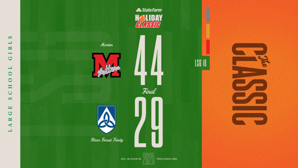 2025 Results LSGLSG: Morton 44 / River Forest Trinity 29 December 27, 2025 by The Classic Team1234TMorton711131344River Forest Trinity5108629 View the game results and box score at TurboStats: https://statefarmholidayclassic.sportstrack.app/basketball/seasons/267/box-scores/9951 Related posts LSB Championship: Normal Community 59 / Rock Island 44 LSG Championship: Washington 52 / Chicago DePaul College Prep 36 SSB Championship: Quincy Notre Dame 72 / Joliet Catholic Academy 59 SSG Championship: Paris 53 / Winnebago 40 Previous Post:LSB: Peoria 54 / Wheaton Warrenville South 47 Next Post:SSB: Quincy Notre Dame 62 / Bloomington Central Catholic 43
