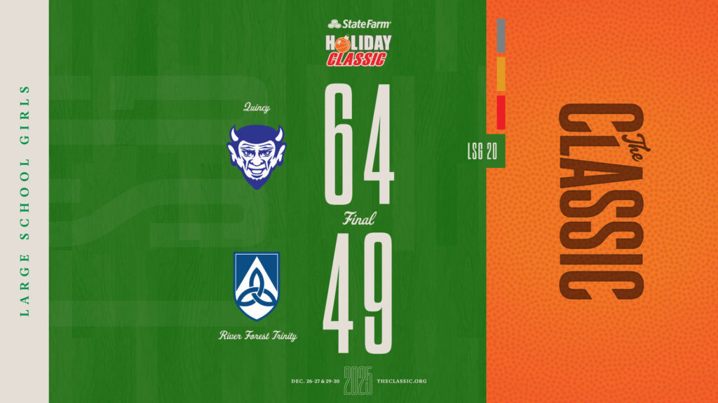 2025 Results LSGLSG: Quincy 64 / River Forest Trinity 49 December 29, 2025 by The Classic 1234TRiver Forest Trinity1112151149Quincy2215111664 View the game results and box score at TurboStats: https://statefarmholidayclassic.sportstrack.app/basketball/seasons/267/box-scores/9955 Related posts LSB Championship: Normal Community 59 / Rock Island 44 LSG Championship: Washington 52 / Chicago DePaul College Prep 36 SSB Championship: Quincy Notre Dame 72 / Joliet Catholic Academy 59 SSG Championship: Paris 53 / Winnebago 40 Previous Post:LSG: Wheaton Warrenville South 42 / Kankakee 37 Next Post:SSG: Bloomington Central Catholic 56 / El Paso-Gridley 47