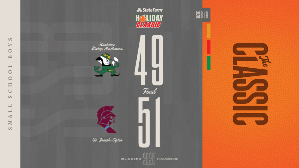 2025 Results SSBSSB: St. Joseph-Ogden 51 / Kankakee Bishop McNamara 49 December 29, 2025 by The Classic 1234TSt. Joseph-Ogden101681751Kankakee Bishop Mcnamara111391649 View the game results and box score at TurboStats: https://statefarmholidayclassic.sportstrack.app/basketball/seasons/264/box-scores/9908 Related posts LSB Championship: Normal Community 59 / Rock Island 44 LSG Championship: Washington 52 / Chicago DePaul College Prep 36 SSB Championship: Quincy Notre Dame 72 / Joliet Catholic Academy 59 SSG Championship: Paris 53 / Winnebago 40 Previous Post:SSG: Port Byron Riverdale 45 / Normal University 39 Next Post:SSB: Bloomington Central Catholic 58 / Rock Falls 55